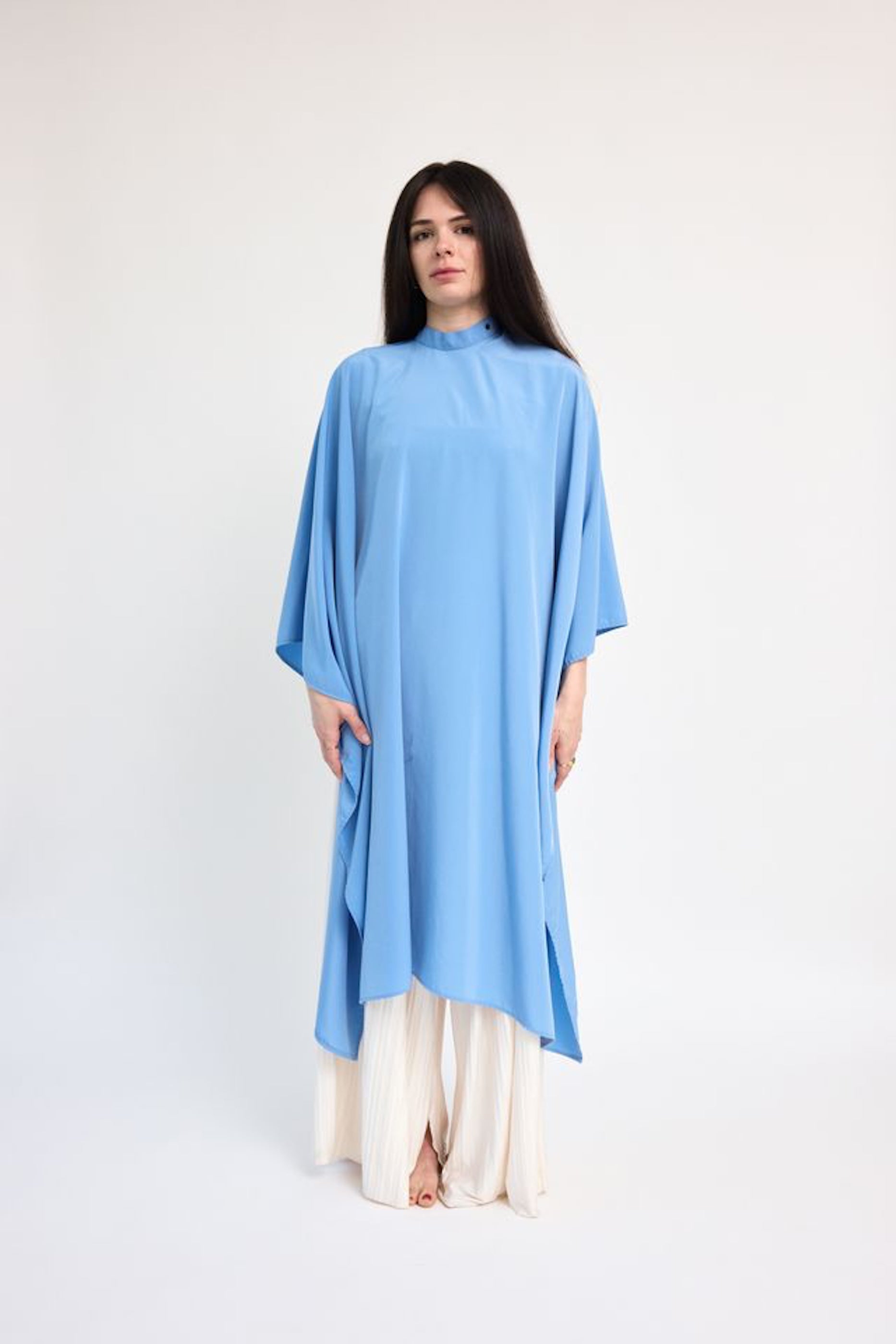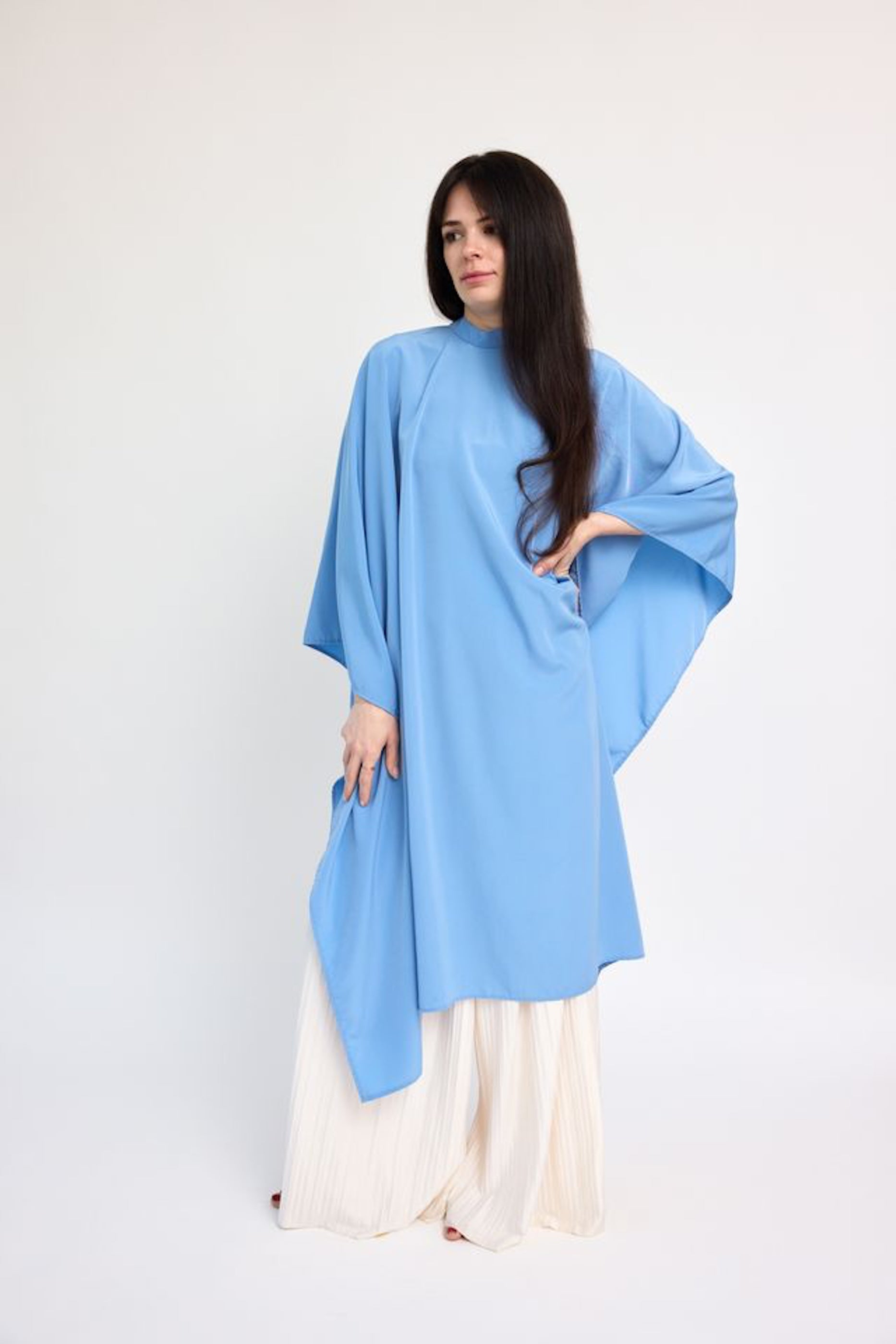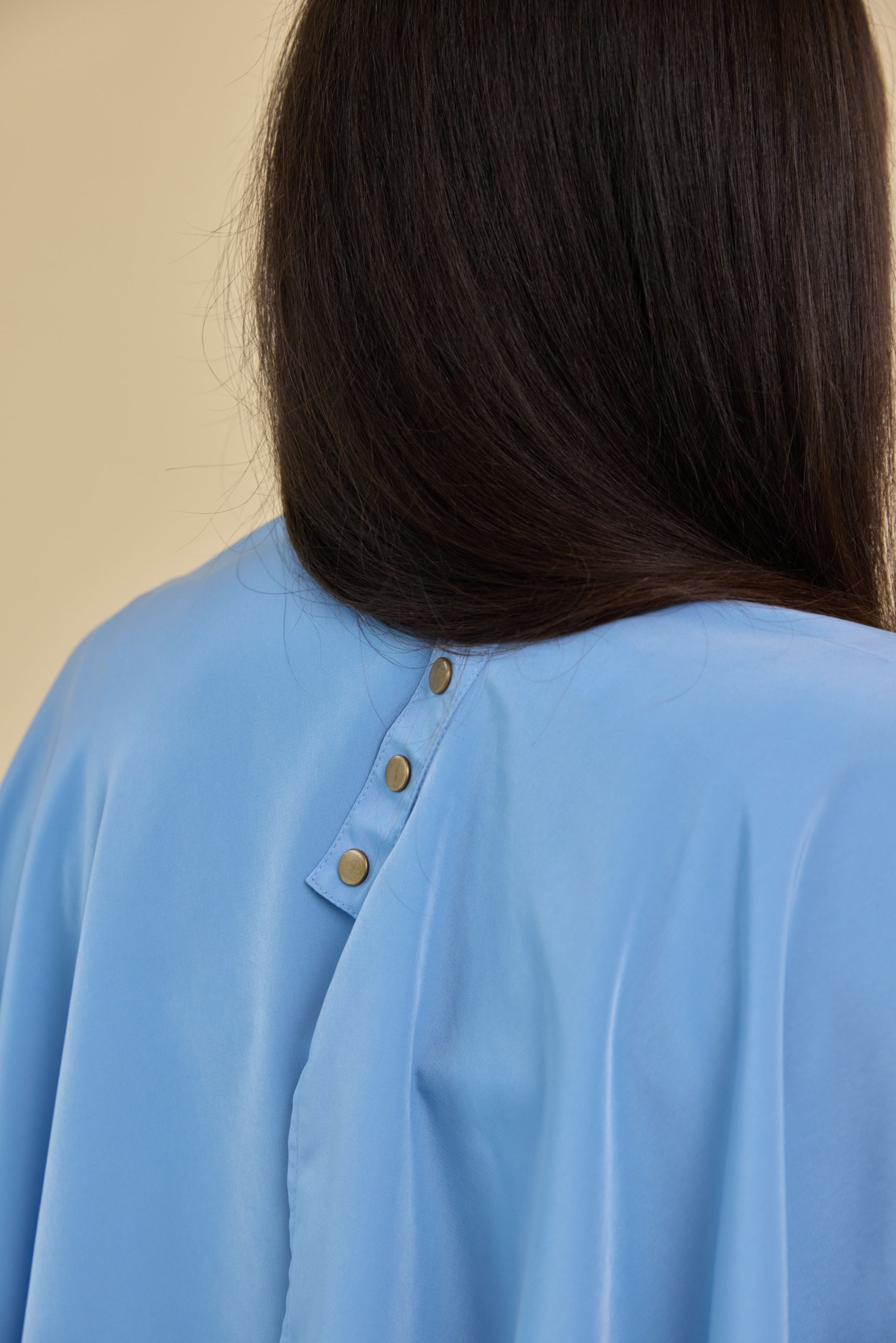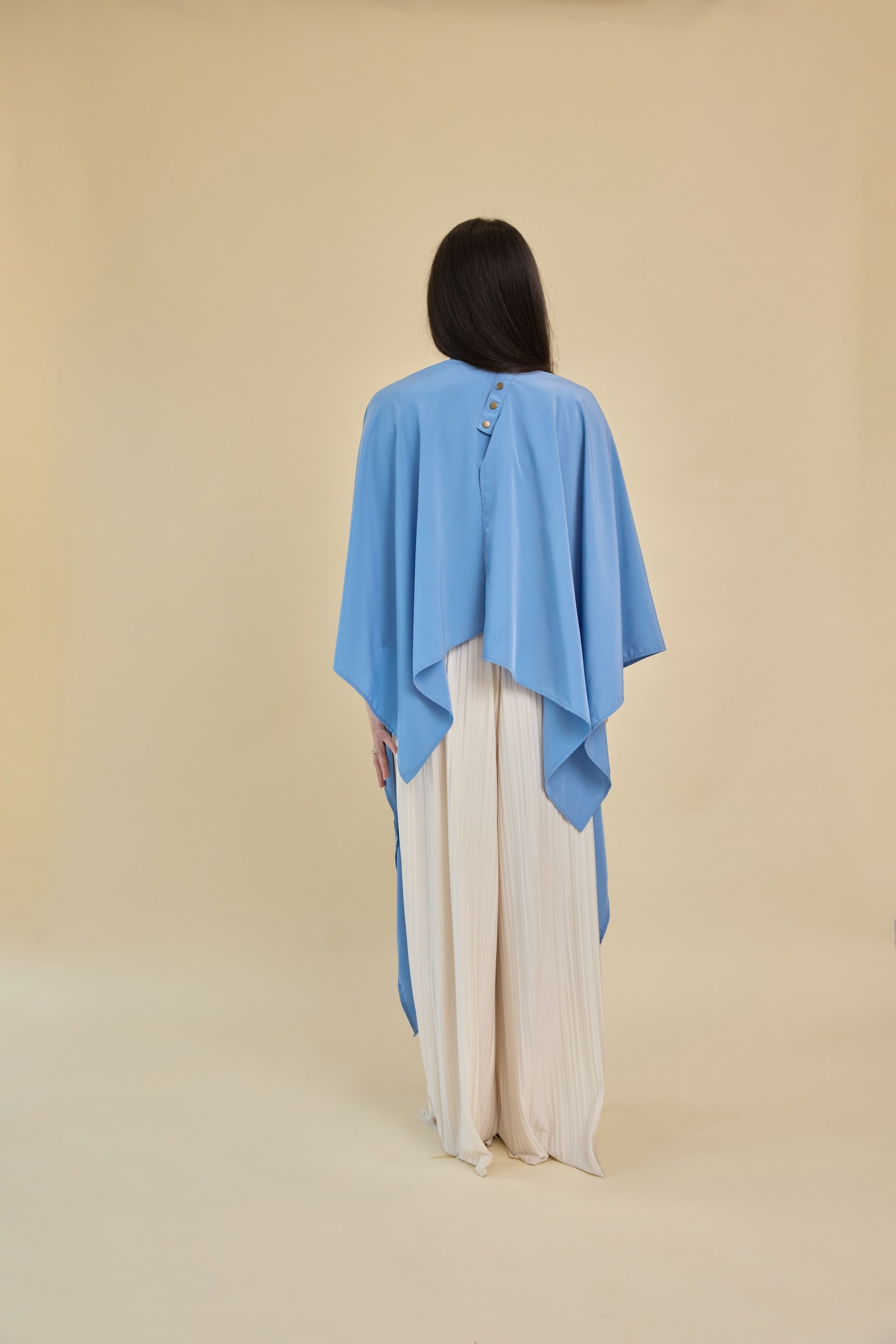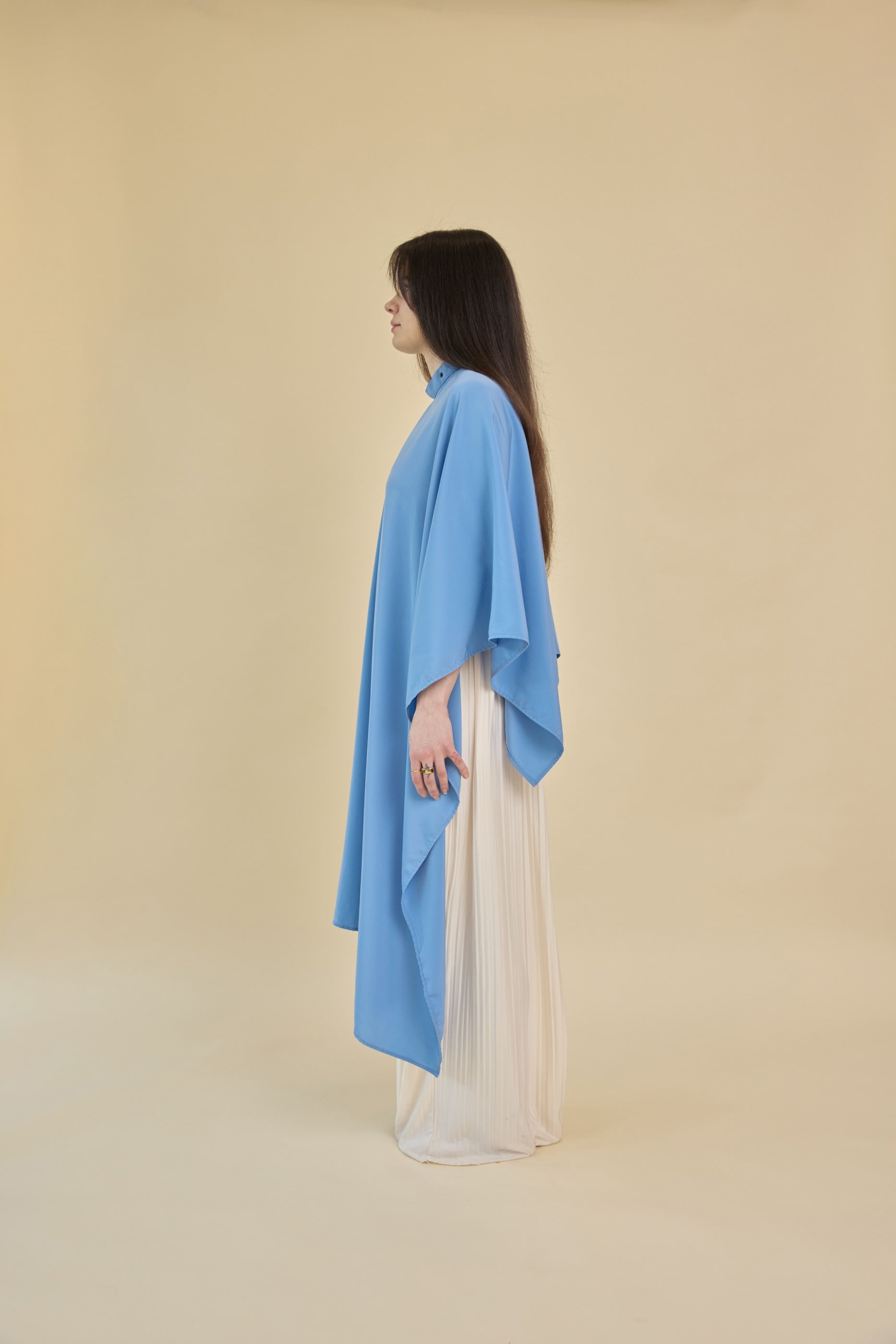 This luxurious cape comes in a stunning ocean blue shade that is accompanied by brushed brass hardware.
