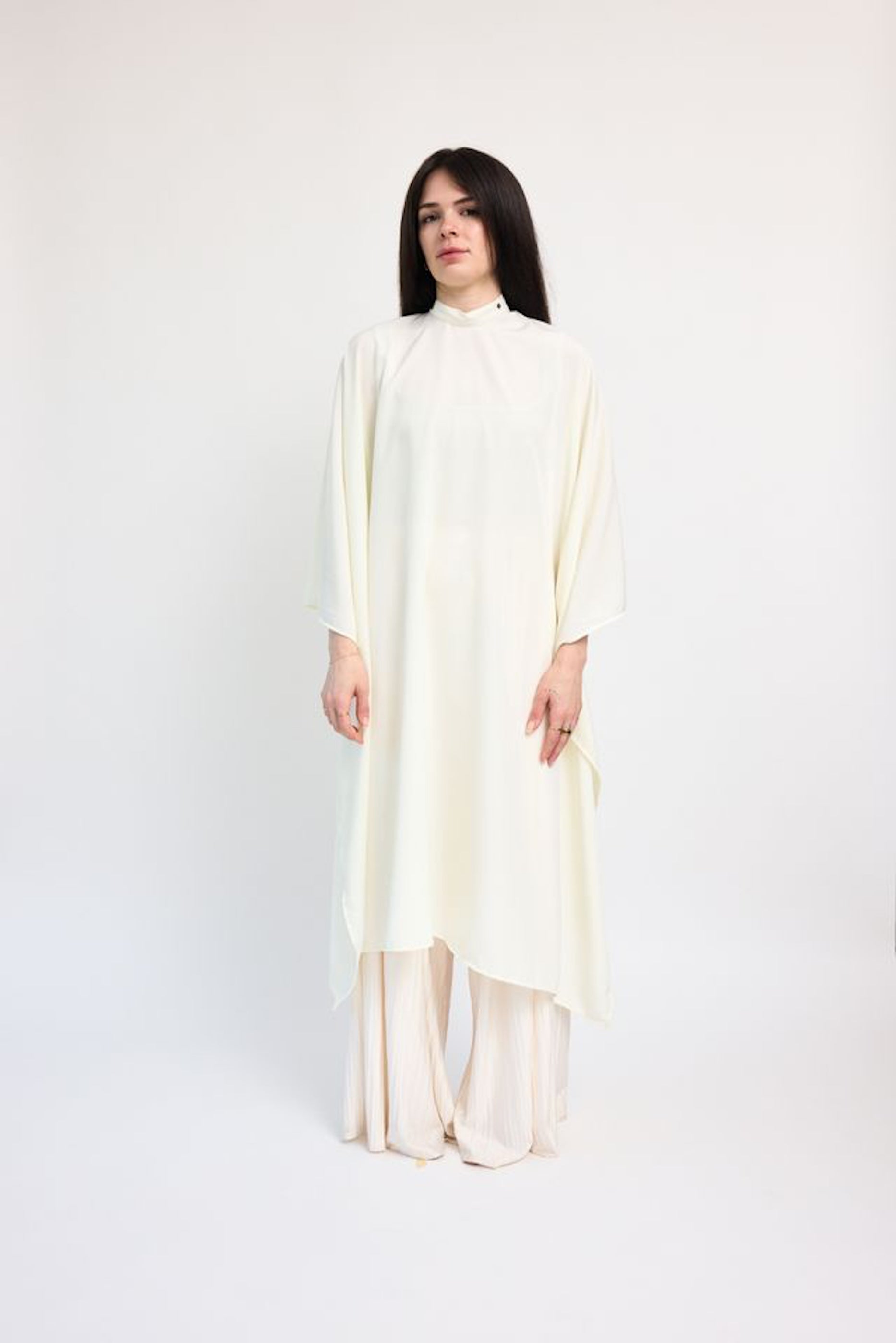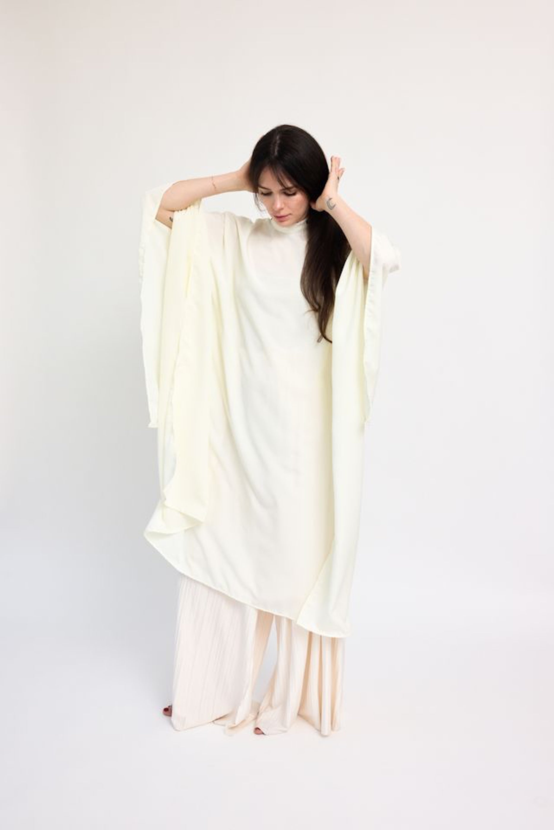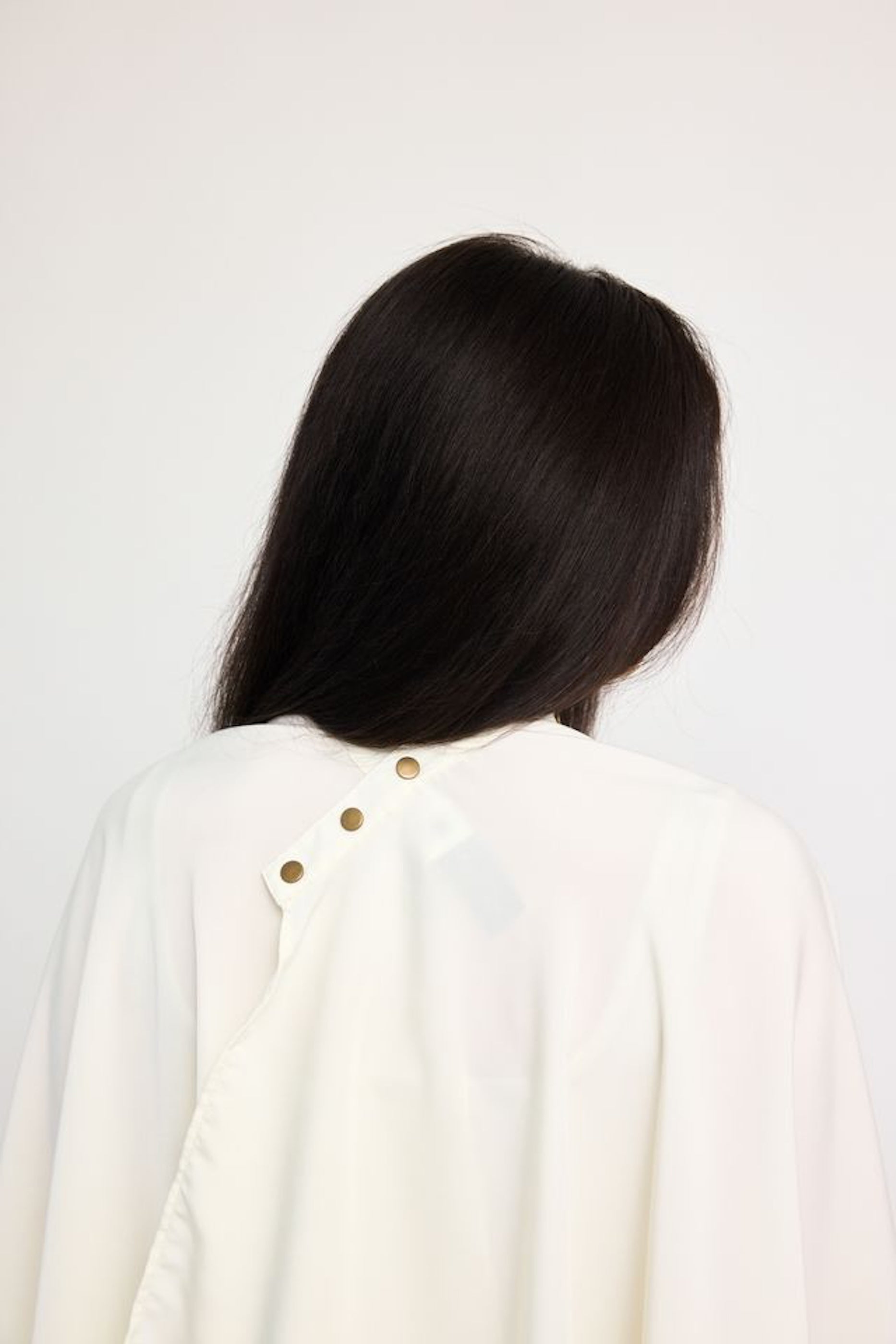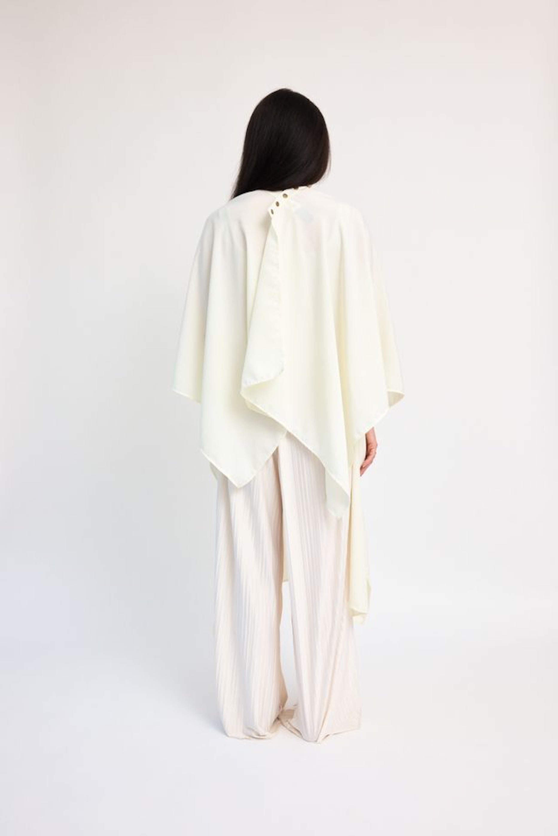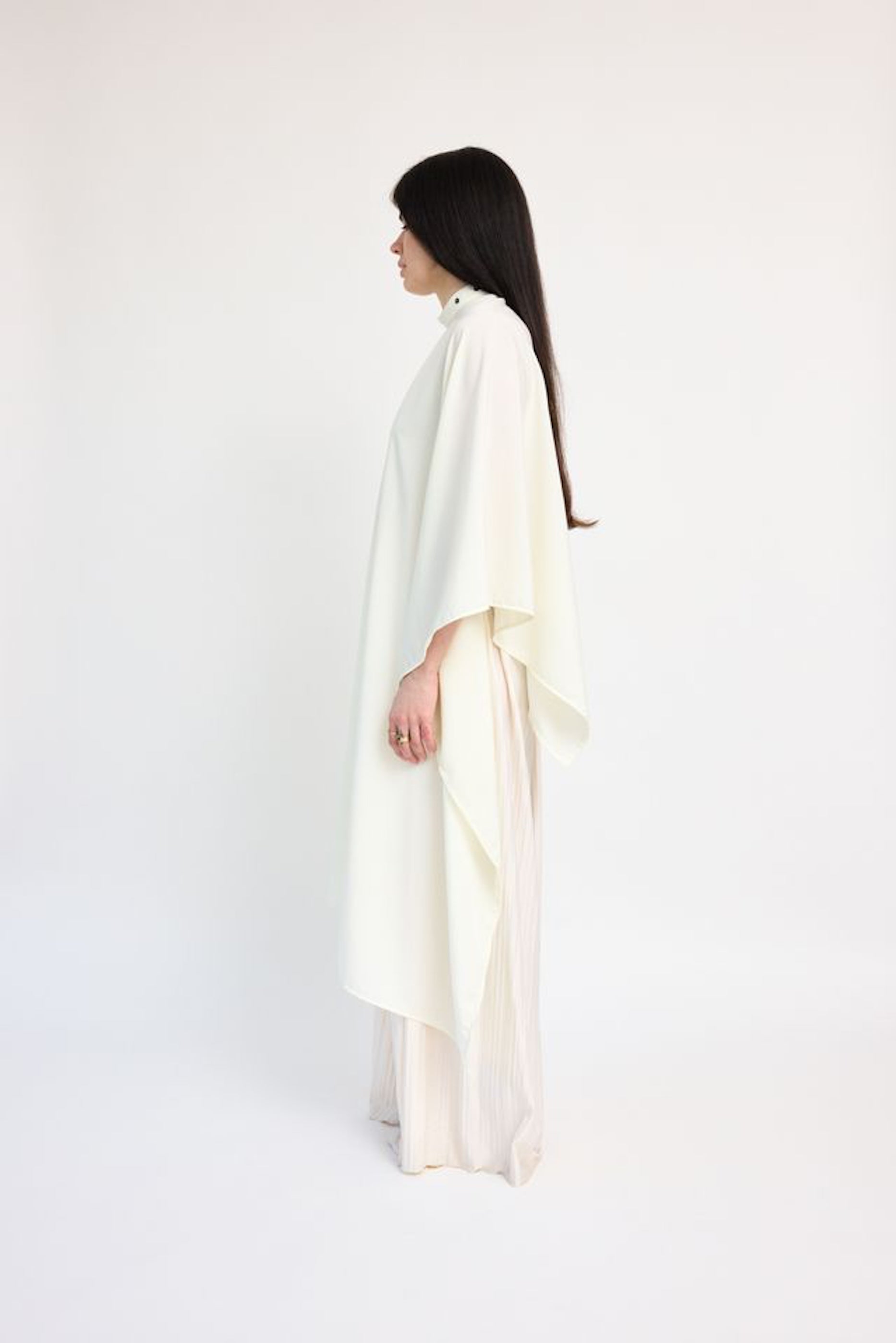 This luxurious cape comes in a dreamy shade of white that is accompanied by brushed brass hardware.