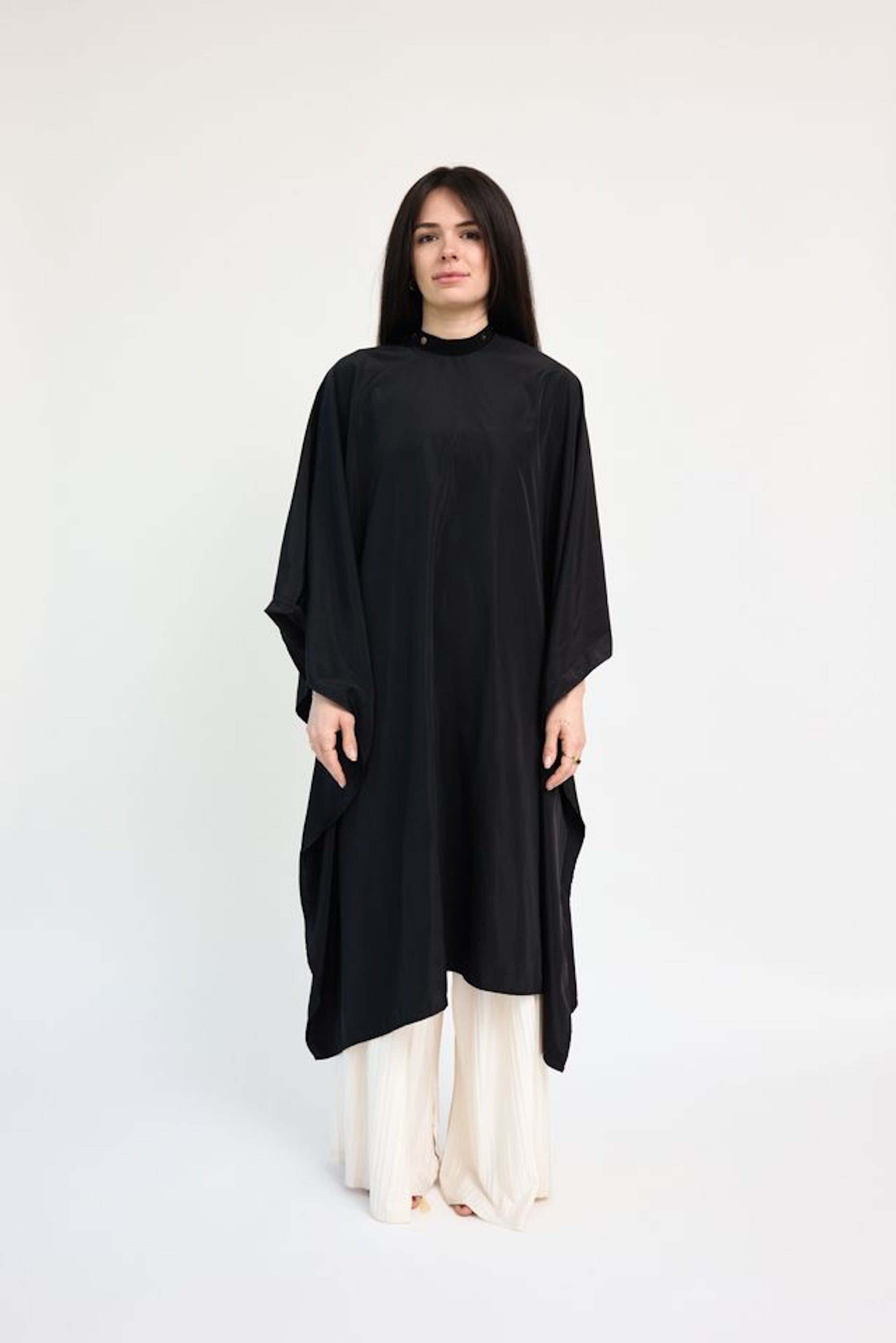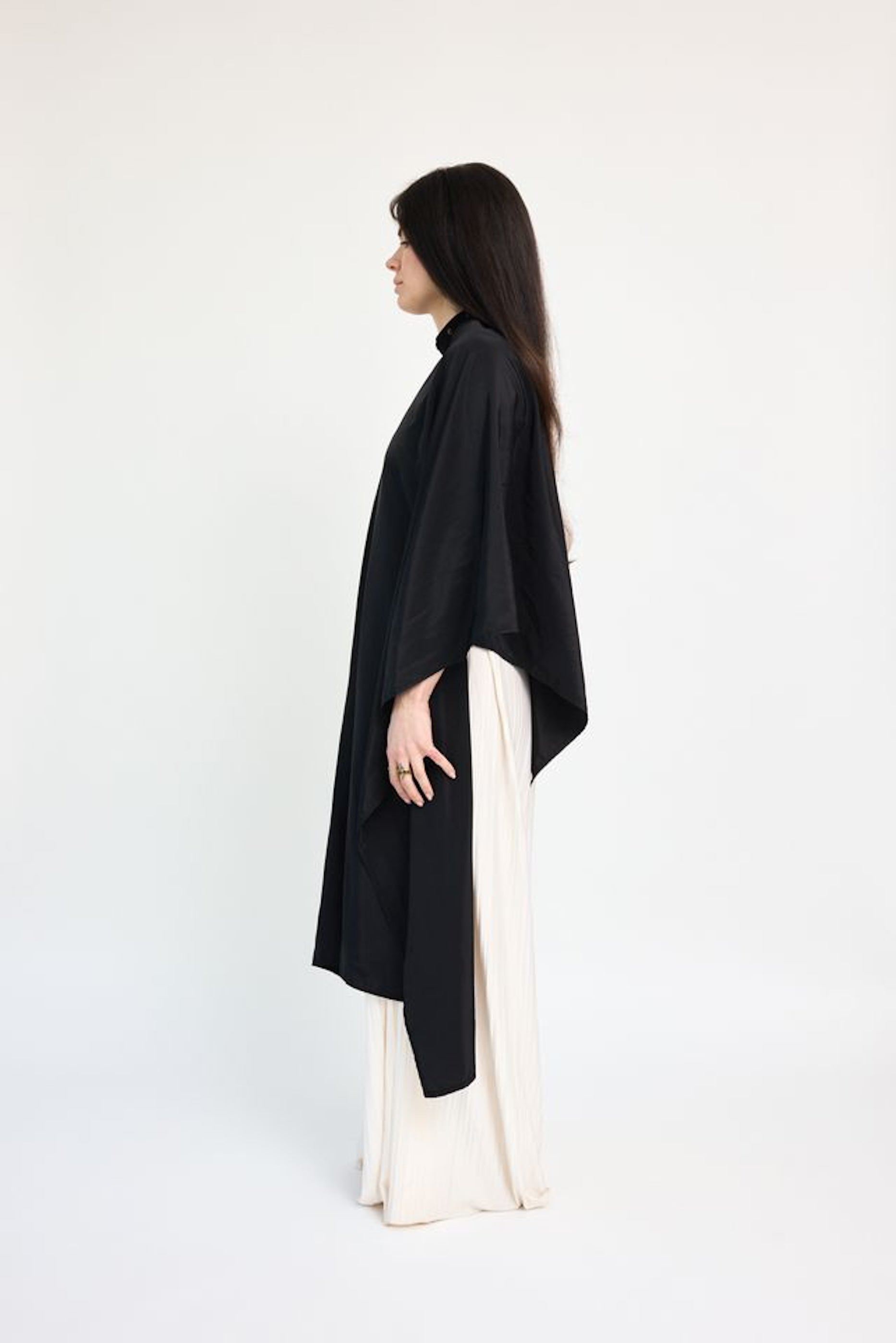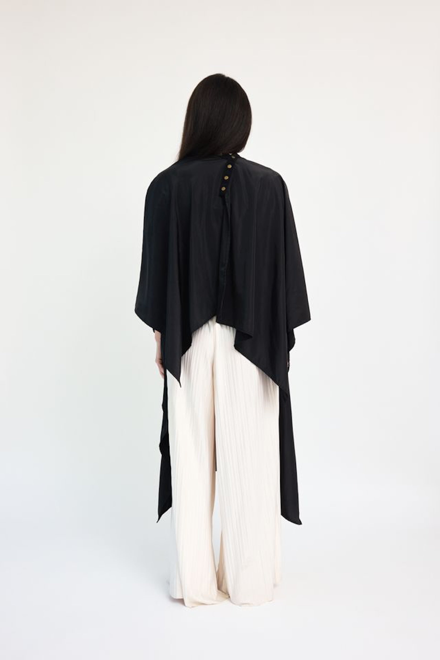 This luxurious cape comes in a stunning black shade that is accompanied by our signature brushed brass hardware.